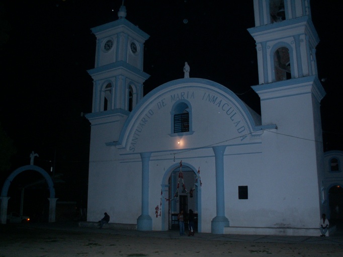 Dopo l'assagio dei comedor de la caridad, dopo una full immersion nella cultura e mentalità cittdina del Messico, dopo un viaggio di 800 km tra autostrade intermibnabili con continui saliscendi e fincheggiate da paesaggi montani equatoriali, con un caldo umido davvero insopportabile, dopo tutto questo e dopo quanto avete visto nelle pagine precedenti adesso finalmente entriamo nel vivo della missione, entriamo nella pagine che danno senso a questo lungo viaggio. Il viaggio, stipati nella combi, tra bagagli, medicine, e tanto, tanto, tanto caldo è finito ed è stato più veloce del previsto. Arriviamo alla meta del nostro cammino nelle prime ore della noche, cosparsi di un sudore reso ancora più insopportabile per l'elevato tasso di umidità che è presente nell'aria. Superiamo il cartello, rigorosamente sponsorizzato dalla Coca Cola, che ci da il benvenuto a Tlacoachistlahuaca (nome che sembra apparentemente impronunciabile, ma un pò di esercizio risolve il problema). Rivedendo le tante foto fatte, mi rendo conto di quanto sia stato avaro di foto nella missione. Ad esempio manca proprio la foto del cartello di benvenuto. Beh, non so a cosa imputare questa lacuna, è certo molte di queste immagini le porto nella mia mente e nel mio cuore, una sorta di tesoro personale, del quale sono particolarmente geloso, perchè fatto di sensazioni ed emozioni che, private di quel clima, private di quegli odori, private di quei suoni, potrebbero apparire stupidi e inutili a chi li guarda. All'arrivo già è buio, ma basta un sottile filo di luna per far splendere la facciata della chiesa, bianca con i contorni di un azzurro cielo. Ritroviamo anche qui la nostra più fedele accompagnatrice, Maria, La chiesetta è infatti dedicata Maria Immacolata. L'avevamo vista già in foto, ma ora che siamo qui, stanchi e presi dalla morsa del sonno, ci semrba davvero un'altra cosa, ci sembra strana, e ancora non ci sembra nostra, come invece la sentiremo alla fine di questo percorso. E' li che ci aspetta per pregare, da soli e in gruppo, ci aspetta per insegnarci tante cose. Non possiamo non entrare almeno un attimo per vedere cosa c'è di dentro. Una foto prima di entrare e poi via. I volti luccicano alla luce del flash per il sudore, e gli occhi luccicano invece per la gioia di essere finalmente arrivati. Tutti i giorni appena trascorsi, sarebbero rimasti vuoti e privi di senso, semplicemente una vacanza, bella magari, ma niente di più, se la nostra meta non fosse stata questa. I festoni, in una alternanza di colori a noi molto familiare, ci fanno notare che qui è festa, la festa di Santiago apostolo, qui molto venerato, e che incontreremo ancora in questi giorni di permanenza. Alle nostre spalle l'edificio della missione, dove svolgeremo il nostro lavoro e le nostre attività. I volti e le voci che ci circondano sanno di missione, sono diversi da quelli incontrati in città, un viaggio nel viaggio è quello che abbiamo compiuto quest'oggi, 27 luglio. Tutti seduti, nel buio di una piccola lampadina da 30W che è più un faro nella notte che non un sole di mezzodì. il potente flash della macchina fotografica lascia i nostri occhi sbarratti, un pò accecati e storditi. La gioia per l'arrivo viene espressa in modo personale, c'è chi, nonostante il sonno riesce ancora a fare un segno di vittoria... Canti di giubilo e di vittoria e occhi che chiedono un letto al più presto! dopo una giornata di snack, gelatini e "schifezze" sintetiche varie, una bella cena messicana è proprio quello che ci vuole, e noi non ce la lasciamo scappare mica, nonostante il sonno e la stanchezza siano davvero in quantità industriali. Ci accoglie il simpaticissimo Padre Raul, frate messicano e parroco di Tlacoachistlahuaca. In Primo piano sulla sinistra Vincenzo e sulla destra Juan Carlos, ormai anche per voi la nostra guida. Domattina egli partirà alla volta di Totolapan per entrare nel noviziato, l'11 di agosto. Colgo questa occasione per fargli avere un ulteriore ringraziamento per la sua disponibilità, per la sua generosità, per la sua semplicità e per la sua testimonianza, non credete che sia facile stare dietro a 9 siciliani in terra straniera senza mandarli a quel paese. Auguri Juan Carlos e Buon cammino, que Dios te bendiga!!!
